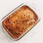 - Cover with aluminum foil and bake for 45 min at 350F. You may want to take the foil off for the last 5-10 minutes, so the cheese on the top will harden a bit