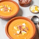 • The most popular salmorejo toppings are diced hard-boiled egg and cured Spanish ham, but you can try other toppings such as avocado, good quality tuna, smoked fish, or chopped fruit like strawberries, cherries, or green apples.