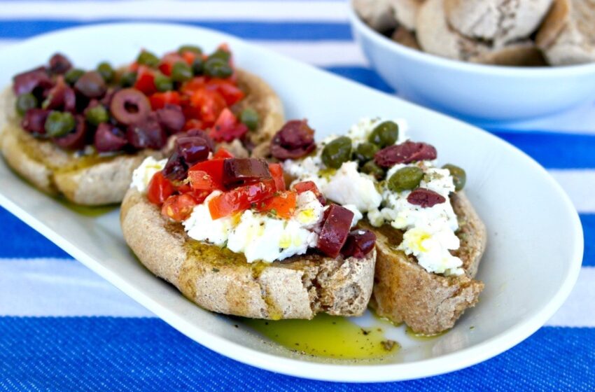 Authentic Greek Barley rusks. Not very easy to find outside of Greece, but so delicious and hearty! This Barley rusk is actually a Cretan rusk and is essentially double baked bread that is made with barley flour and sometimes a whole wheat flour. Making rusks was practiced in families that could not bake bread very often so they made these rusks. In addition rusks lasted a long time and traveled well. Barley flour was often used because it was more filling, which was necessary in those lean times.