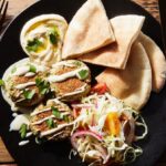 - Lightly oil a rimmed baking sheet. Using a ¼-cup measuring cup, portion out 12 ping pong-sized balls and place on sheet, spacing 1" apart. Gently press down on tops to flatten slightly. Brush tops with 1 Tbsp. oil. Bake falafel, turning balls halfway through, until golden brown and crispy, 20–25 minutes. Wrap pitas in foil and warm in oven during last 5 minutes of baking.