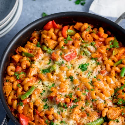 - Add 2 cups of the marinara, the chopped basil, and ½ cup of the mozzarella to the pasta. Gently stir to combine.
