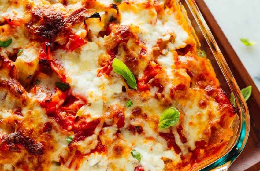 This baked ziti recipe is lightened up with roasted vegetables. Golden mozzarella, sizzling red sauce and tender pasta make this vegetarian ziti super delicious!