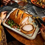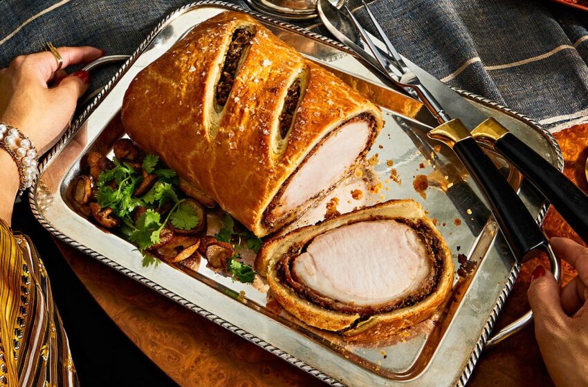 For this Thanksgiving centerpiece, recipe developer and fashion designer Peter Som combined the flavors of very Cantonese Char Siu pork with those of very British Beef Wellington. As a kid, there was nothing Som liked more than when his grandmother would bring over still-warm Char Siu from Chinatown; he prized the edges in particular—slightly charred and fatty, with ample amounts of that sticky honeyed glaze. This version features pork loin marinated in a classic salty-sweet mixture of hoisin, honey, Shaoxing wine (Chinese rice wine), and five-spice powder, then roasted inside an old-school puff pastry crust. Meanwhile, the marinade is repurposed to create a silky, umami-rich gravy that comes together in a jiff. There are quite a few steps to this recipe, but most of the work can be done in advance, which will make day-of cooking a snap.