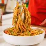 - Pour the sauce over the noodles and mix thoroughly.