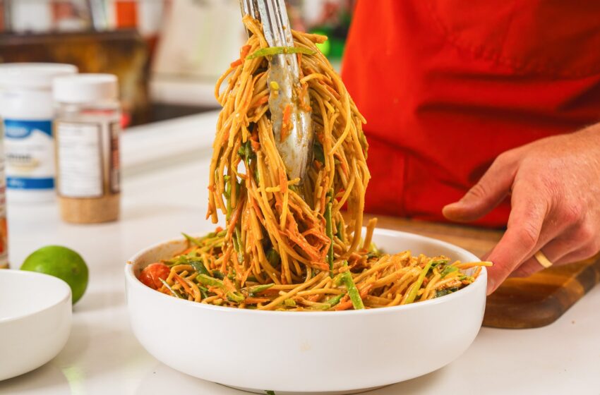 - Add peanuts and mix into the noodles and sauce mixture.