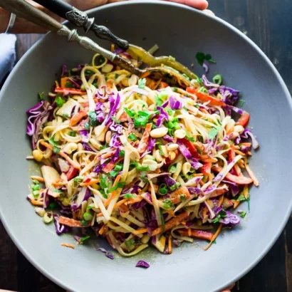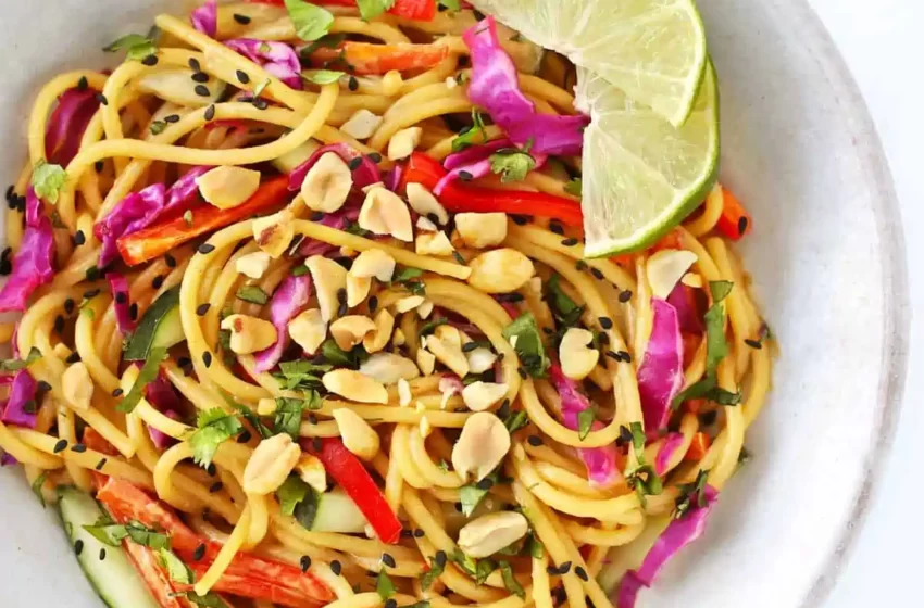 - Toss Noodles: Toss the cooled spaghetti noodles with the peanut dressing.