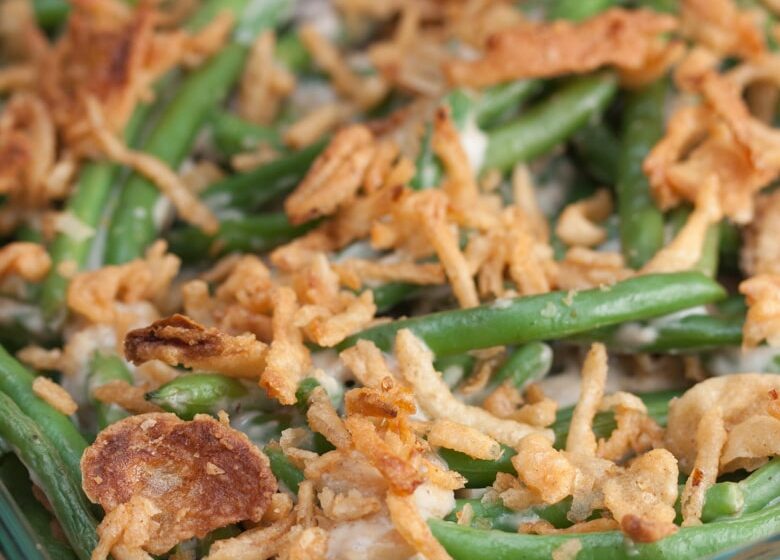 - Stir sour cream mixture into hot beans, and pour into a greased 1 quart casserole dish. Top with cheese, and onion rings (if using).