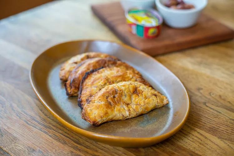 These handheld versions of empanada Gallega, the large savory pie from Galicia, Spain, are stuffed with tuna, hard-boiled eggs, and chopped olives.Chef Katie Button makes small hand-held versions, empanadillas, and mixes the filling with sofrito, an aromatic vegetable base of long-cooked tomatoes, onions, and garlic. She wraps it up in a pastry dough enriched with lard, which she says makes an incredibly flaky crust. Freezing the lard and then grating it allows you to easily incorporate it into the dough without it melting, and results in more flaky, puffy layers of pastry in each bite.