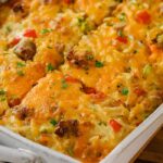Eggs, sausage, peppers, and hashbrowns are layered in a casserole dish, topped with cheese and baked into a perfect golden brown breakfast casserole.