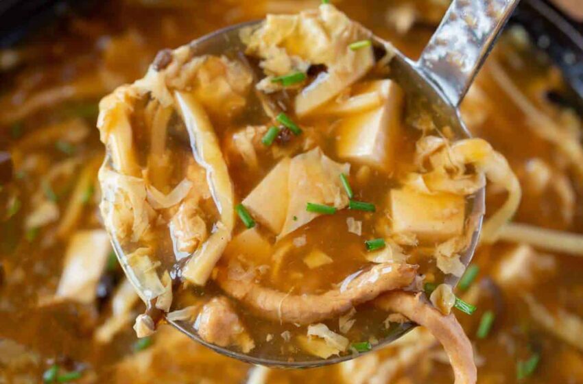 - Bring the stock to a boil in a soup pot over high heat. Add the black Chinese mushrooms, the Golden Needles, and the bamboo shoots. Adjust heat to low and simmer, covered, for 5 minutes. Stir in the pork, raise heat, and when it boils again, add the bean curd and mo-er mushrooms. Lower heat, cover, and simmer for about 3 minutes. Give the cornstarch mixture a big stir and add to the soup slowly with one hand, as you stir with the other until it is satiny smooth. Turn off heat. Pour the beaten egg over the surface in a wide circle; as it congeals into floating ribbons, stir gently a few times to break them into chiffony flakes.
