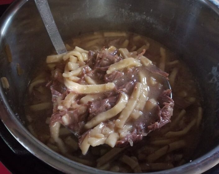 - Return the shredded beef back into the Instant Pot, and add the pack of frozen egg noodles. Turn the Instant Pot to Saute for 5 minutes.