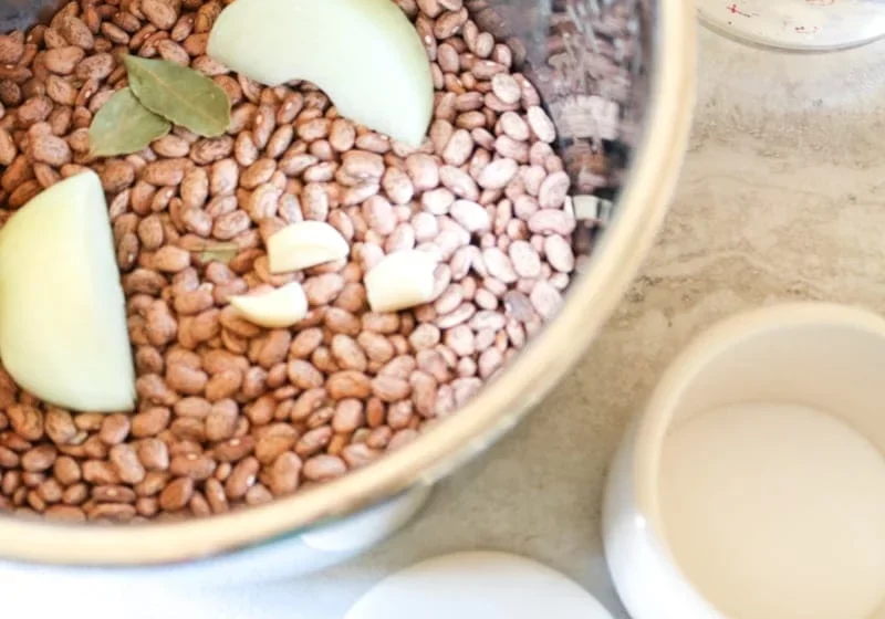 - Place beans, water, onion, and bay leaf if using in the inner pot of a pressure cooker.