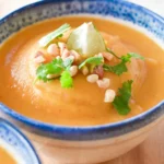 - Scoop into bowls and garnish with a section of lime (squeeze into soup), a tablespoon of cilantro and a tablespoon of chopped peanuts.