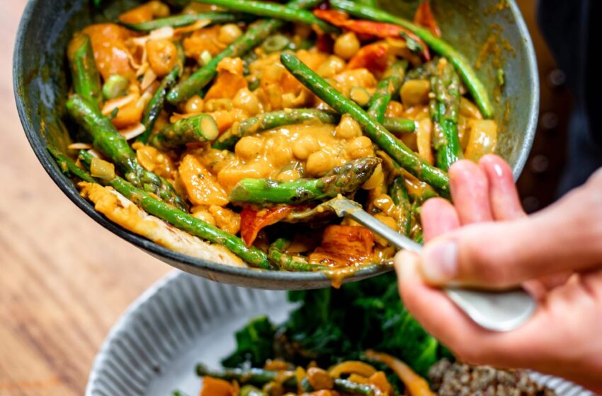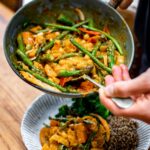 - Add the red pepper, courgette/zucchini, fine beans, broccoli and asparagus. Cook for a few minutes before adding the chickpeas.