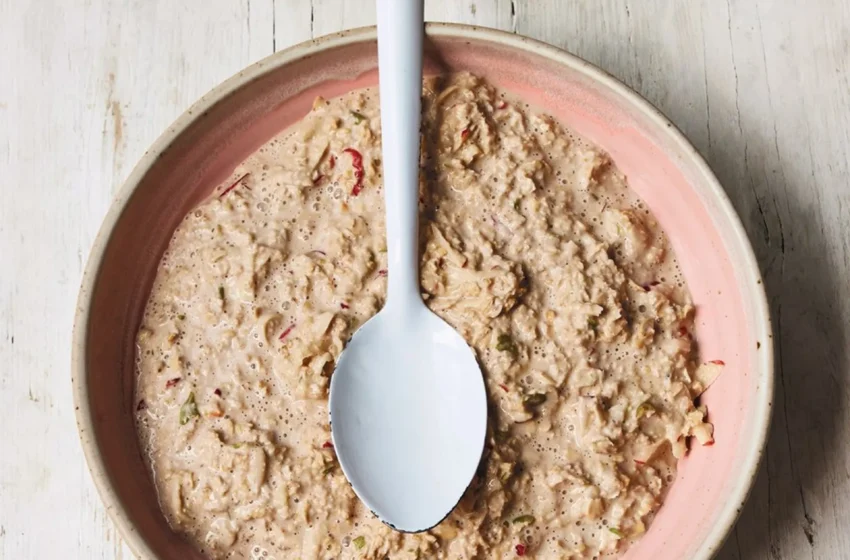 - In the morning, grate in most of the apple and pear and give the mixture a good stir, adding a splash more milk to loosen, if needed.