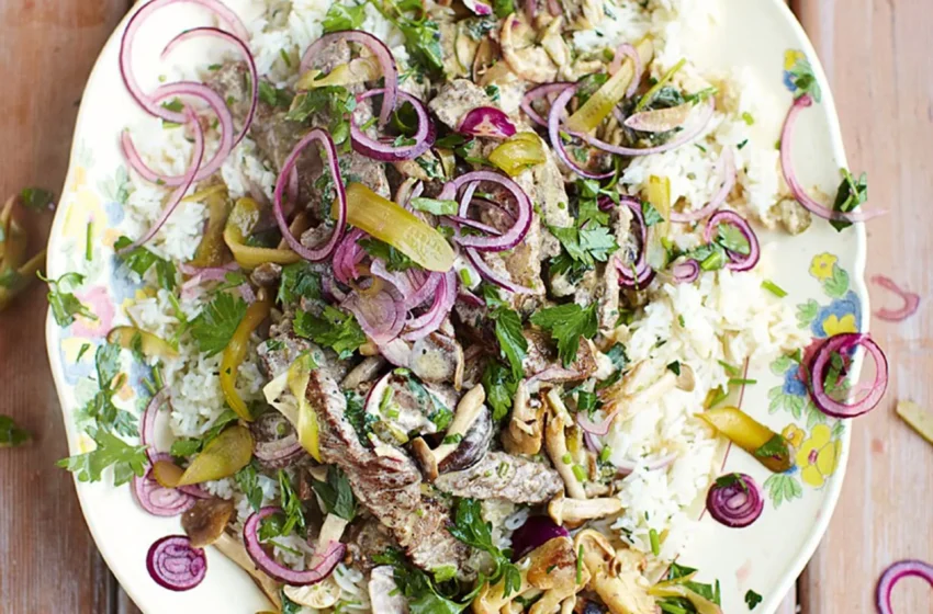Fluffy rice, red onion & parsley pickle.This quick beef stroganoff recipe is creamy, light and cooks in the time it takes to do the rice.