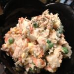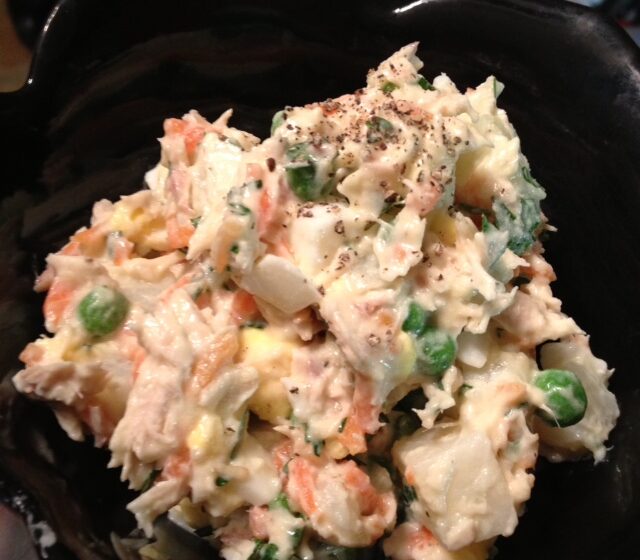 Ensaladilla Rusa is an iconic Spanish tapa, basically a simply dressed potato salad with tuna and peas.
