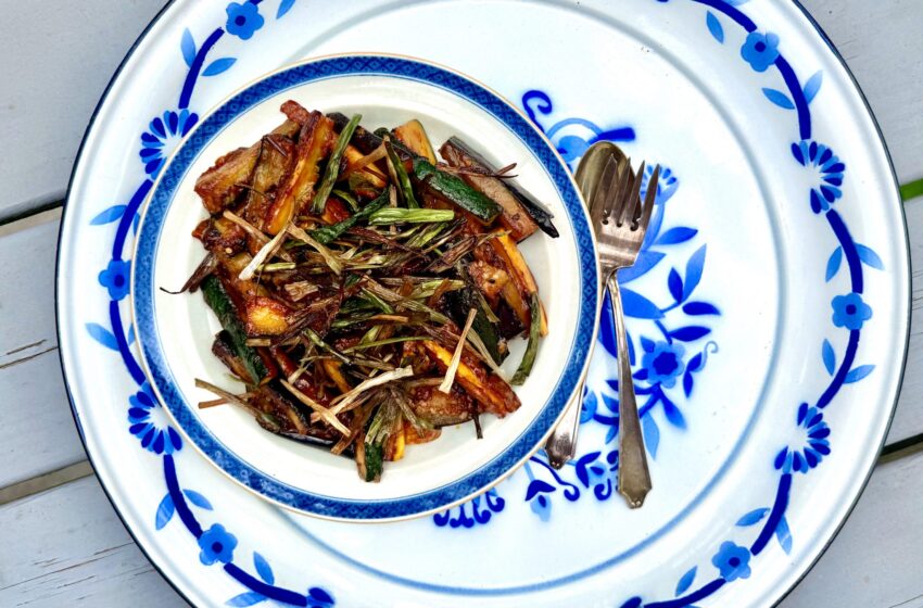Korean Spiced Eggplant and Zucchini with Crispy Scallions
