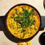 - Heat broiler. Uncover skillet and broil kuku, watching closely, until top is set and lightly browned, 2–3 minutes. Remove skillet from broiler and scatter herbs over kuku, squeeze juice from lemon wedges over, and season with more pepper.