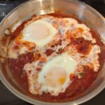 If you prefer, once you’ve cracked the eggs into the indentations, you can use a fork or a chopstick to mix the egg whites into the sauce (without disturbing the yolks). It might tidy up the presentation a bit.