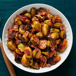Sweet maple syrup, tangy Dijon, and salty bacon are a perfect combination for these crispy, golden-brown Brussels sprouts.