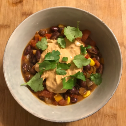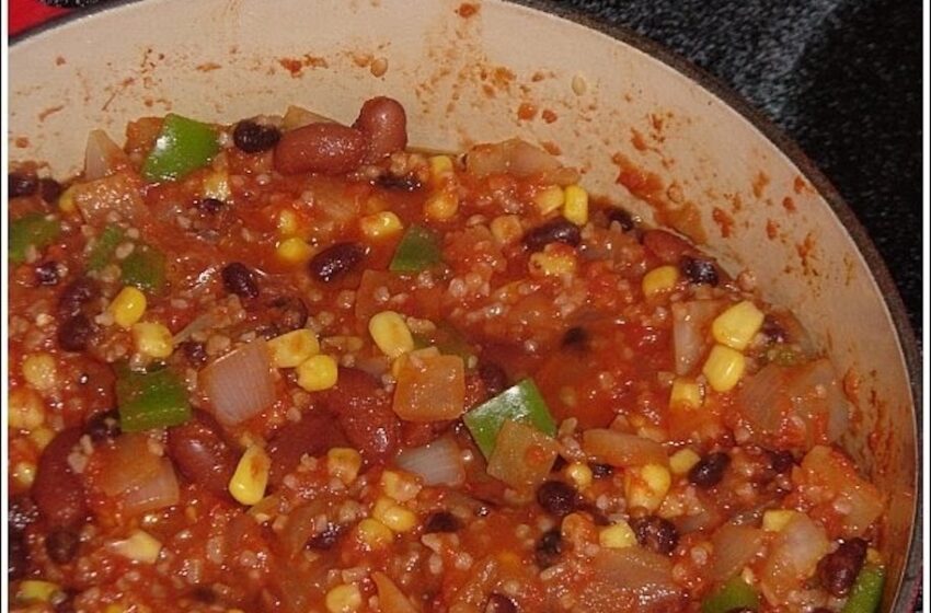 Moosewood Red, Gold, Black, and Green Vegetarian Chili