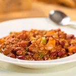 This is a traditional chili, except bulgur replaces the ground meat. The bulgur really does give a ground-beef-like texture. It also enhances the protein content.