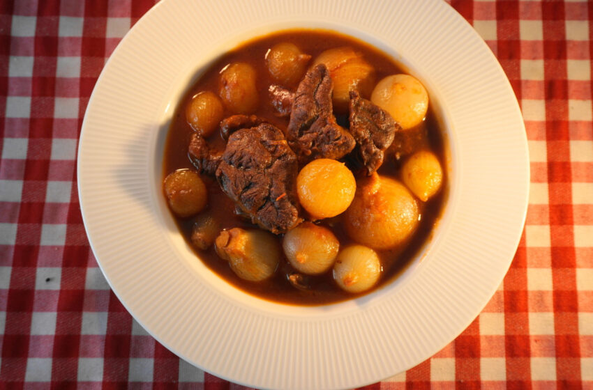 Moschári Stifado (Beef Ragout with Onions, Vinegar, and Tomato Sauce)