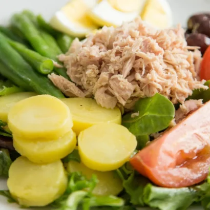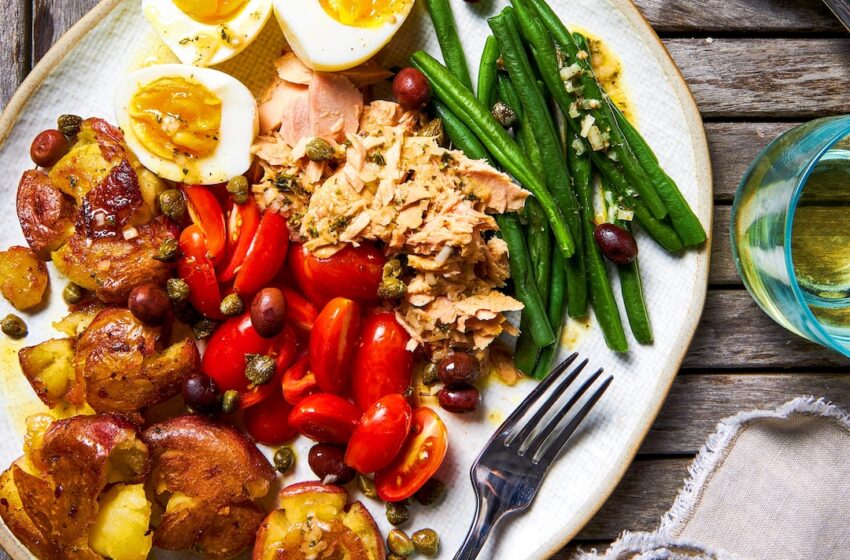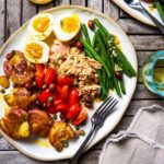 - Divide tomatoes, tuna, and beans between 2 plates, piling them in separate mounds. Transfer cooked eggs to cold water to chill for 30 seconds. Peel and halve eggs, and place 3 halves on each plate. Divide potatoes between plates. Drizzle each salad with 2 tablespoons vinaigrette. Sprinkle salads with olives and capers and serve, passing extra vinaigrette.