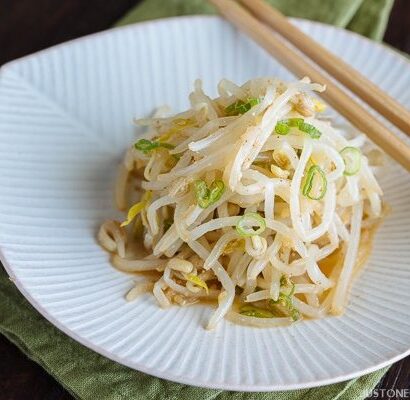 - Add the bean sprouts and scallions, and cook for 1 minute. Place in a serving dish, and garnish with coriander (cliantro).