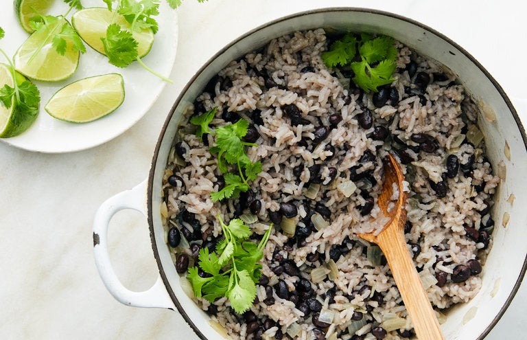 Not only is rice with beans adored the world over (see: gallo pinto, khichdi, hoppin’ John and Caribbean rice and peas), it even has its own Wikipedia page. This deeply flavored rendition is inspired by these comforting traditions and a desire to wash as few dishes as possible: The rice cooks with the beans and the starchy liquid they’re canned in. As the two ingredients cook together, the beans disperse and glom onto the rice. For an extra kick, sauté chopped jalapeño with the onions, or add ¼ cup salsa with the stock.