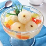 This compote is a mixture of exotic oriental fruits. We use cans of fruits; fresh fruits would perhaps be better, but are often very hard to find, and may involve additional preparation.