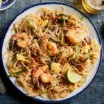 - Use your spatula to push aside the noodles and leave them there, making an empty space in the center of the wok. Crack the egg into the empty space and let it cook until the edges start to set, 15 to 20 seconds. Use the edge of your spatula to break up and roughly scramble the egg, then toss it back in with the noodles while the egg is still soft. Once the egg looks mostly cooked, remove from the heat and throw in the bean sprouts and green onions, tossing thoroughly to combine. Transfer to a plate and garnish with the peanuts, chile powder, and lime wedge.