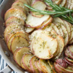 Parmesan Crusted Potato Gratin made in a skillet with layered red potatoes, butter, fresh rosemary and grated Parmesan cheese.