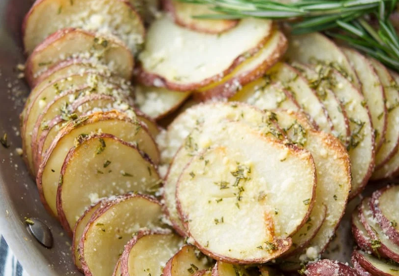 - Next, wash the potato skins with a vegetable brush under cold water; then dry them off. Slice the potatoes into ¼-inch thick round slices and place them in the skillet in a circular pattern.