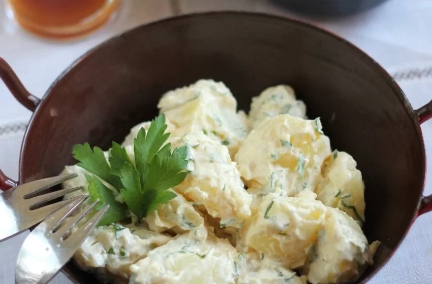 - Once the potatoes are cooled and peeled, slice them into 1-inch cubes. Coat in the alioli, and garnish with the chopped parsley.