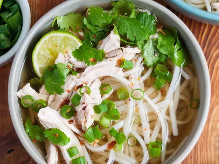 - Finish the pho: Bring the strained broth to a boil over high heat. Put the noodles in a noodle strainer or mesh sieve and dunk in the hot broth to heat and soften, 5 to 60 seconds. Lift the noodles from the pot and divide between the 2 bowls. [Cook's note: I didn't find it necessary to soften my noodles any further. I just added them to the bowls and poured the hot broth over top. However, dunking them in the broth would make them more flavorful!]Lower the heat to keep the broth hot while you arrange the chicken on top of the noodles and garnish with the chopped green onion, cilantro, and a sprinkling of pepper. Taste and adjust the broth’s saltiness one last time. Return the broth to a boil and ladle into the bowls. Enjoy with any extras, if you like.[Cook's note: I just left the broth at a low simmer during this last step, rather than bringing it to a boil again. I thought it was plenty hot!]