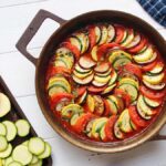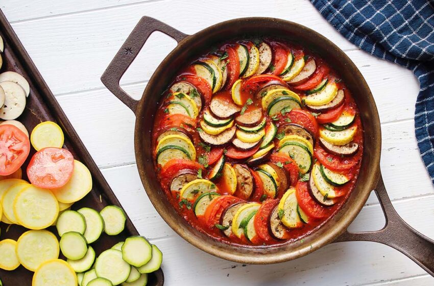 - Arrange remaining vegetables to the skillet, arranging them in a circular pattern, to fill the skillet. Drizzle with olive oil and sprinkle with salt and pepper.
