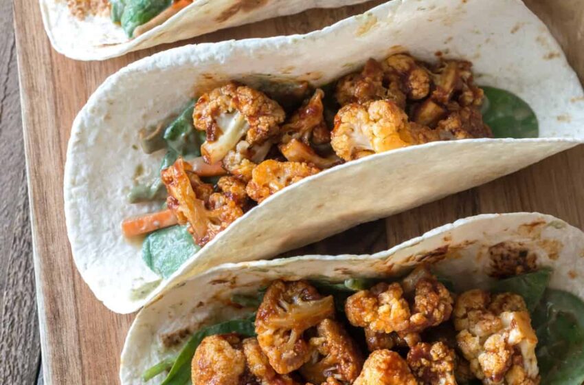 - Assemble the Tacos. Fill each tortilla with roasted cauliflower. Top with baby spinach, shredded carrots, and a drizzle of crema. Garnish with hot sauce and serve with lime wedges.