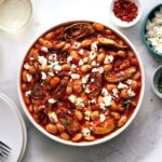 - Transfer bean mixture to a large serving bowl or dish. Top with feta, oregano, and red pepper flakes and drizzle with oil. Let sit at least 10 minutes for feta to soften before serving warm or at room temperature.