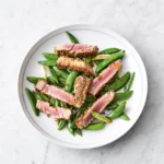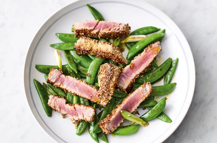 - Slice the sesame tuna and serve on top of the veg, drizzled with 1 teaspoon of extra virgin olive oil.