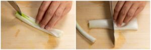 - To make the Shiraga Negi (white scallion topping), score the white stalk of the Tokyo Negi and peel off the outer white layers. The light green inner core can be used for the aroma oil. Cut the outer layers of the Tokyo Negi‘s white stalk into pieces about 2 inches (5 cm) long.
