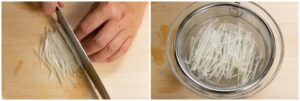 - Next, finely julienne these outer white layers. Soak in cold water for 5 minutes to remove the bitterness. Drain and set aside.