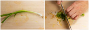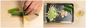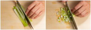 - Cut some dark green tops of the Tokyo Negi into julienned strips and finely mince them into small pieces. You can also light green leaves of the Tokyo Negi (the inner core) leftover from preparing the Shiraga Negi (See Step 2 of the “To Prepare the Toppings“ section below). Simply score the white stalk of the Tokyo negi and peel off the outer white layers to reveal the core.