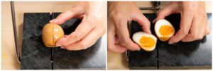 - Slice 4 Ramen Eggs (Ajitsuke Tamago) in half using a fishing wire or cheese cutter (that‘s what I use). A knife doesn‘t give a clean cut, but you can use it. I top each bowl with 2 halves of ramen egg.