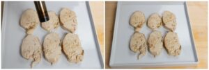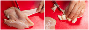 - Remove the skin of 1 boneless, skin-on chicken breast with a knife and your hands. It should come off easily by pulling and tearing. Next, cut the 1 chicken skin into 1-inch pieces.