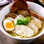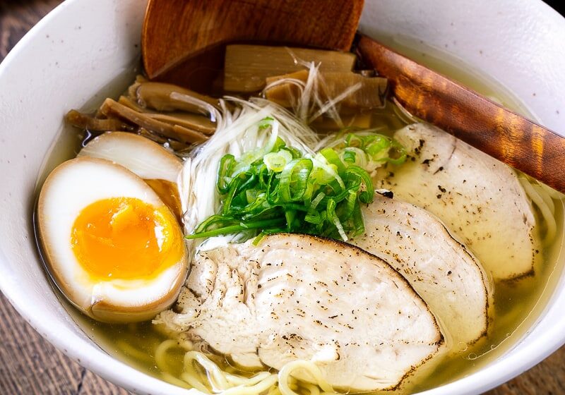 Shio Ramen (or Salt-Flavored Ramen) is one of the most popular styles of ramen in Japan! Toothsome noodles are nestled in a base of dashi and clear chicken broth and topped with seasoned bamboo shoots, sliced chicken chashu, and jammy ramen eggs. It’s a bowlful of comfort and soul! This authentic and straightforward recipe is proof that you can enjoy restaurant-quality ramen at home. {Vegetarian/Vegan options included}