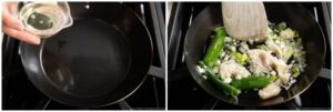 - In a small frying pan, add ¼ cup neutral oil, the chicken skin pieces, light and dark green parts of the Negi, and minced garlic. Turn on the stove to medium low.