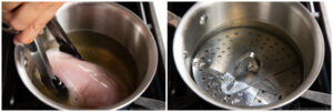 - Once boiling, add the chicken breast, making sure it is covered by the liquid, and lower the heat to medium. Put an Otoshibuta (drop lid) on top of the chicken so it is completely submerged in the liquid. Make sure to keep it gently simmering (not boiling) for 25–30 minutes.
