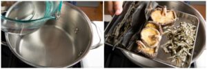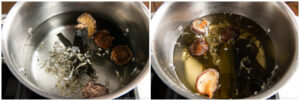 - In a large pot, combine 12½ cups water, ⅔ oz Kombu, ⅔ oz dried Shiitake, and ⅔ oz Iriko/Niboshi (boiled and dried anchovies). If you use several pieces of Kombu, count them so you know how many pieces to remove later.